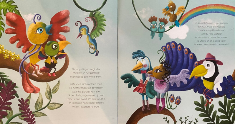 Papa en mama Raaf kijken vol trots naar hun nest met daarin drie eitjes. Al snel breken twee eitjes open en worden er twee kleine zwarte raafjes geboren. Wanneer ook het derde eitje openbreekt, ziet Raffa het levenslicht. Maar mama schrikt. Raffa is niet pikzwart, hij heeft een aantal gekleurde veertjes en dat hoort niet. Raven hoorde pikzwart te zijn. Papa verft Raffa's gekleurde veertjes zwart, om te verbergen dat Raffa anders is dan de andere raven. Wanneer Raffa in een regenbui terecht komt, spoelt de zwarte verf weg en al snel wordt hij uitgelachen door zijn broertjes. Mama stelt voor om elke dag Raffa's veren te verven, zodat niemand ziet dat Raffa anders is dan alle andere raven. Met zijn zwarte verenkleed, wordt Raffa niet meer uitgelachen en mag hij fijn samen spelen met alle andere raven. Raffa is voor even heel gelukkig. Maar dan ontmoet Raffa de kleine kleurrijke vogel Mia. Mia vertelt Raffa dat hij juist trots moet zijn op zijn prachtige gekleurde veren en hij niet moet verstoppen wie hij is. Wanneer Raffa aan papa en mama vertelt dat hij zijn veren niet meer zwart wil verven, zijn zijn ouders boos. Raffa verlaat verdrietig het nest... Een raaf is misschien doorgaans zwart, maar Raffa wil zijn kleurrijke veren niet langer verborgen houden. Hij verlaat het nest om op zoek te gaan naar een plek waar hij zichzelf kan zijn en geaccepteerd wordt zoals hij is.