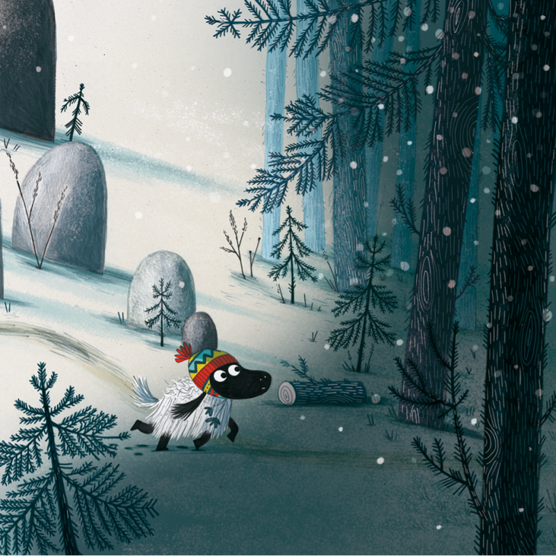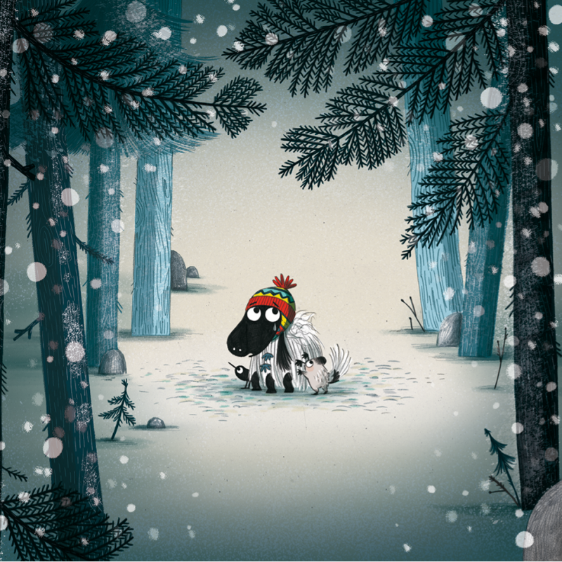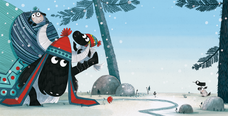 De tekeningen in het boek zijn van de Britse illustrator Kate Hindley. De tekeningen met veel grijs en blauwtinten en contrasterende felle kleuren, zitten vol grappige details, waar de kinderen graag naar zullen kijken. De wollige mutsen en dekens van de kudde jakken, zitten vol kleurrijke patronen,, waar mijn juffenhart meteen leuke knutselactiviteiten bij ziet