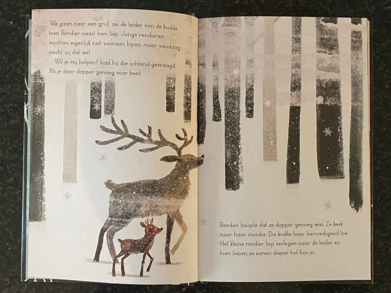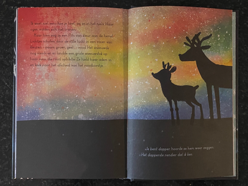 "Rendier & Roodborstje" is geschreven door Rosa Bailey en geïllustreerd door Carmen Saldaña. Het boek is verschenen bij Veltman Uitgevers. De illustratie op de kaft van het kleine roodborstje op de snuit van het rendier, in een donkere omgeving voorzien van schitterende zilveren sneeuwkristallen, is voor mij al reden genoeg om dit boek te willen lezen. Het is de eerste winter van Rendier en zij is betoverd door de prachtige witte vallei, de sneeuwvlokken die vallen en een vallende ster in de donkere nacht, wanneer zij samen met haar kudde op weg is naar een grot om de gure winter in door te brengen. Rendier kijkt echter te veel om zich heen om te genieten van al het moois en verliest hierdoor de kudde uit het oog. Rendier verdwaald en is helemaal alleen. Maar wat hoort ze toch steeds? Het is het getjilp van een Roodborstje en al snel sluiten Rendier en Roodborstje vriendschap. Natuurlijk is Roodborstje bereid om Rendier te helpen haar kudde terug te vinden en samen beginnen ze aan de lange en bovenal magische reis naar de grot waarin de kudde wacht.