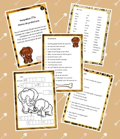 Een pakket met 5 leesteksten over de prehistorie, met bij elke tekst een blad met vragen, een blad met dmt oefenwoorden en een extra werkblad, met bij elke tekst een andere opdracht.