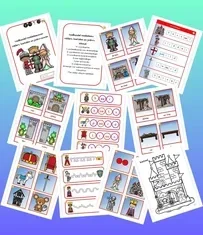 Een vrolijke bundel bomvol taalopdrachten rond de middeleeuwen met kleurrijke ridders, kastelen en jonkvrouwen. Inhoud: 44 woordkaarten, 4 voorbeeldkaarten voor de letterblokjes, 16 woordkaarten met plaatsbepalingen, 15 woordkaarten bij de letterspelmat, 10 paar tegenstellingen, 9 paar rijmwoorden, 16 schrijfpatroonkaarten, 36 kaartjes voor auditieve synthese en analyse en 3 kleurplaten. Met doelen, uitleg en spelideeën.
