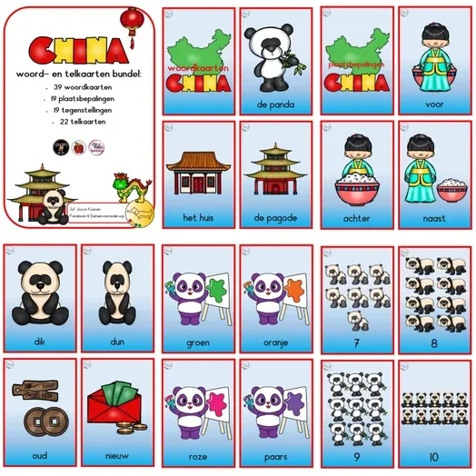 In deze bundel vind je allerhande woord- en telkaarten rond het thema China: woordkaarten, plaatsbepalingen, tegenstellingen, kleurkaarten en telkaarten tot en met 20. In totaal 30 pagina's! Alles vrolijk geïllustreerd met aansprekende afbeeldingen. Er zijn meerdere bundels rond China op komst vol activiteiten, zodat je zelf kunt kiezen welke je wilt gebruiken.