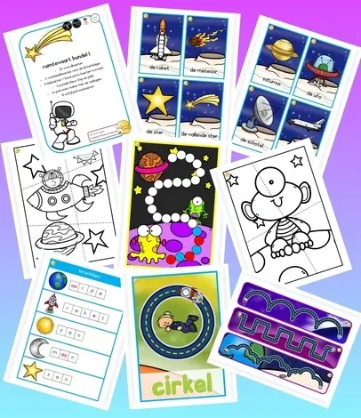 Leuke bundel rond het thema ruimtevaart, ook leuk voor de Kinderboekenweek 2022: worden wat je wilt en het thema beroepen. In deze bundel vind je 29 woordkaarten, 2 voorbeeldkaarten voor de letterblokjes, 6 kleikaarten met vormen (ook leuk met loose parts), 4 puzzels om te kleuren, knippen en plakken, 4 patroonkaarten voor de teldopjes en 15 schrijfpatroonkaarten. Een vrolijke bundel met 30 pagina's voor de kleuters.