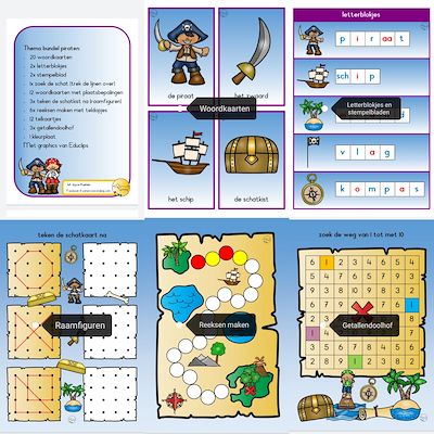 Een vrolijke bundel van 30 pagina's met diverse taal- en rekenopdrachten, in het thema piraten! Met woordkaarten, plaatsbepalingen, letterblokjes, stempelbladen, telkaarten, getallendoolhoven, reeksen maken, raamfiguren en een kleurplaat. Alles met de graphics van Educlips. Binnenkort volgt de bijpassende bundel rond zeemeerminnen, in dezelfde stijl, maar met allemaal nieuwe opdrachten. Kijk ook op mijn Facebook groep Juf Joyce Kuenen voor gratis extra materialen.