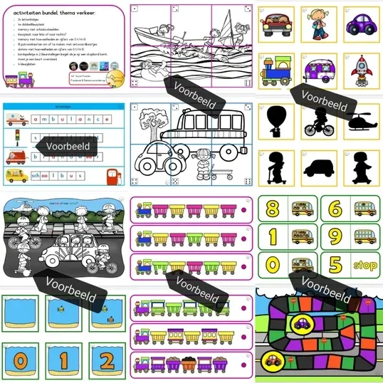 35 pagina's vol activiteiten rond het thema verkeer voor de kleuters. Inhoud: letterblokjes, dobbelkleurplaten, memory met schaduwbeelden, kleurplaat naar links of rechts, memory met hoeveelheden en cijfers, patroonkaarten, domino met hoeveelheden en cijfers, bordspel en kleurplaten. Alles is vrolijk en kleurrijk geïllustreerd.