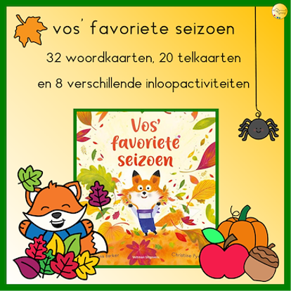 Vos' favoriete seizoen: een vrolijke bundel met 32 woordkaarten, 20 telkaarten en 8 verschillende inloopactiviteiten: schaduwmemory, 4 voorbeeldkaarten voor de letterblokjes, 4 puzzel-dobbel-kleurplaten, 24 schrijfpatroonkaarten, 20-frame kaart met eikeltjes, 12 patroonkaarten om na te maken, 3 werkbladen om groepjes te maken en een kleurplaat. Deze bundel is te gebruiken bij het prentenboek Vos' favoriete seizoen, maar is natuurlijk sowieso voor thema herfst.