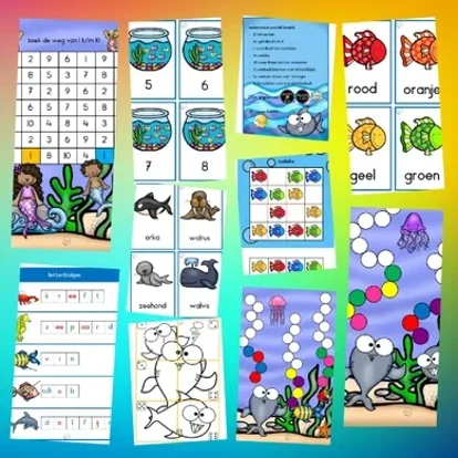 Een bundel over de onderwaterwereld, met woordkaarten, telkaarten, getallendoolhoven, kleurkaarten, voorbeelden voor de letterblokjes, kaarten om reeksen te maken met de teldopjes, sudoku's en een puzzeldobbelspel. Alles in een vrolijk gekleurd jasje. Met wel 33 pagina!'!