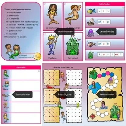 Een vrolijke bundel van 30 pagina's vol zeemeerminnen, met woordkaarten, letterblokjes, stempelbladen, plaatsbepalingen, raamfiguren, reeksen maken met teldopjes, getallendoolhoven en 5 kleurplaten. Met de graphics van Educlips. Qua stijl past deze bundel perfect bij de piraten bundel die ook te koop is in deze shop, zodat de kinderen kunnen kiezen of ze met de piraten of met de zeemeerminnen aan de slag gaan. Samen vormen ze een mooi compleet thema.
