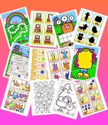 Een vrolijke en kleurrijke bundel in het thema monsters, met 12 verschillende inloop-activiteiten / spelletjes voor kleuters. Inhoud: 6 voorbeeldkaarten om patronen te leggen; 48 kaartjes rond ruimtelijke; 2 tien-frame kaarten; memory met schaduwbeelden, 4 dobbel-puzzel-kleurplaten; 20 schrijfpatroonkaarten; 2x dobbel zes op een rij (rekenspelletje); 20 combineerkaarten (logisch denken; cijfer en telkaarten tot en met 12; 4 kleikaarten; domino en kleurplaat. Genoeg activiteiten dus voor een hele klas!