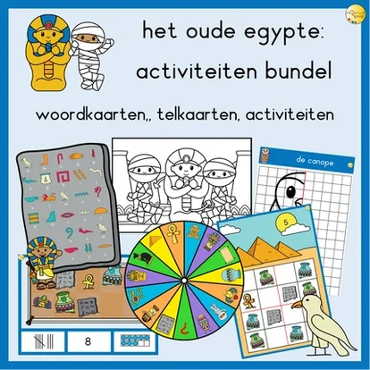 19 woordkaarten, 2x stempel de woorden of schrijf de hiërogliefen, 18 woordkaarten met plaatsbepalingen, hiërogliefen alfabet, bingo met draaischijf en 6 bingokaarten, hiërogliefen geheimschrift met 4 werkbladen, 10 telkaarten voor bij de zandtafel, 5 spiegeltekeningen, 5x sudoku, matrix: combineer de canope met de vorm, 5 kleurplaten.