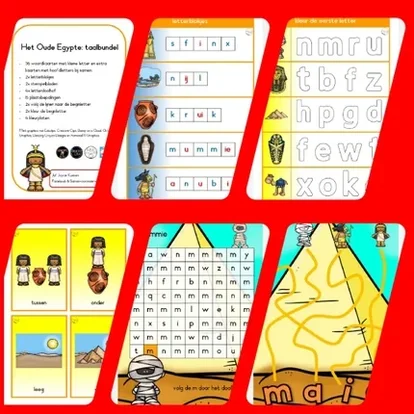 Een vrolijke bundel in het thema Het Oude Egypte met diverse activiteiten rond taal, woordenschat, letters en klanken voor kleuters.